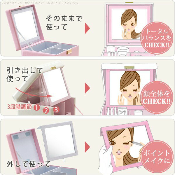 サイズ(cm):幅22x奥行20x高さ25cm(取っ手含まず)・約2.1kg引出し内寸:幅19x奥行き8.5x高さ9cm鏡サイズ:15.5x13.5cmボトル収納部深さ:20.5cmカラー:ピンク・ホワイト 白 材質:外装-合成皮革、構造材-中質繊維板、内装-PVC(ポリ塩化ビニル)貼り完成品送料について配送について送料無料※沖縄・離島・一部地域を除く詳しくはお問い合わせ下さい。